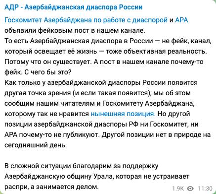 «Госкомитет Азербайджана по работе с диаспорой и APA объявили фейковым пост в нашем канале. То есть Азербайджанская диаспора в России — не фейк, канал, который освещает её жизнь — тоже объективная реальность. Потому что он существует. А пост в нашем канале почему-то фейк. С чего бы это?» — задаются вопросом в АДР
