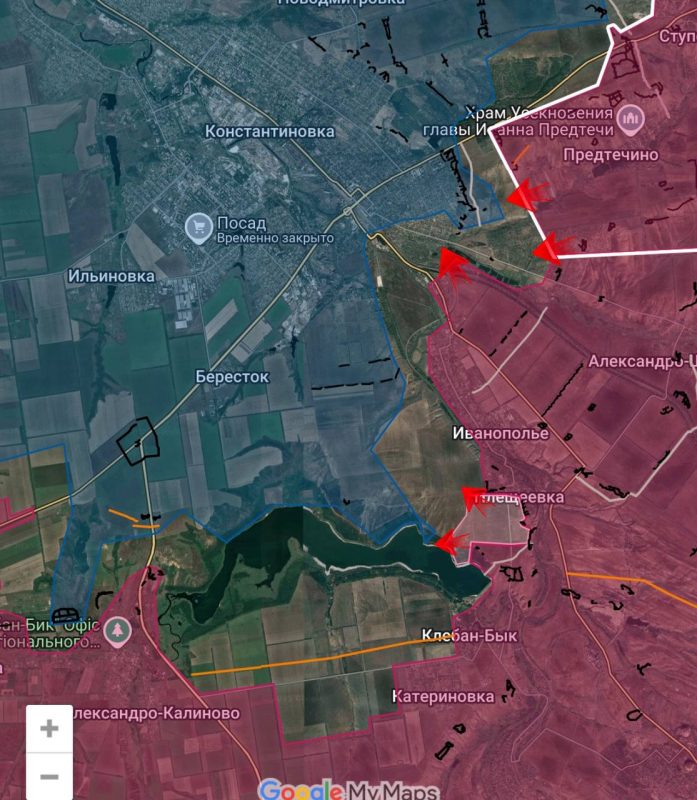 Карта СВО. На Константиновском направлении российские войска атакуют севернее Иванополья.