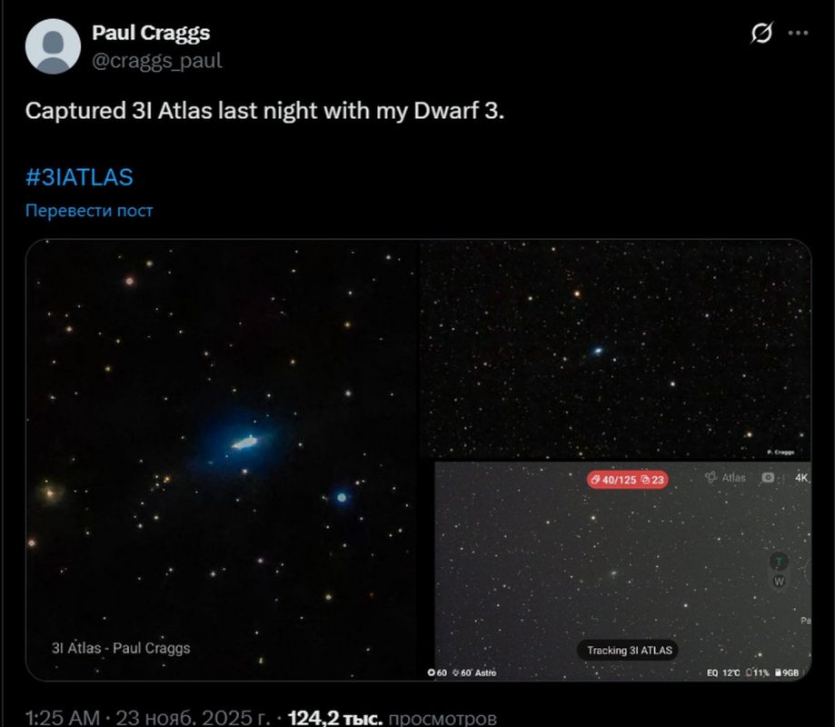 Третий пользователь добавил: «Один из самых странных снимков 3I/ATLAS! На этом новом снимке, сделанном астрофотографом Полом Крэггсом с помощью телескопа Dwarf 3, 3I/ATLAS выглядит как яркое, тонкое, как лезвие, белое ядро, окруженное гладким голубым ореолом».