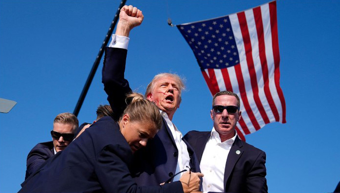 Ради этого «красивого» фото все и делалось. 13 июля 2024 года — первое «покушение» на Трампа, охрана кандидата в президенты США уводит его со сцены после выстрелов. Фото: Эван Вучич, Википедия