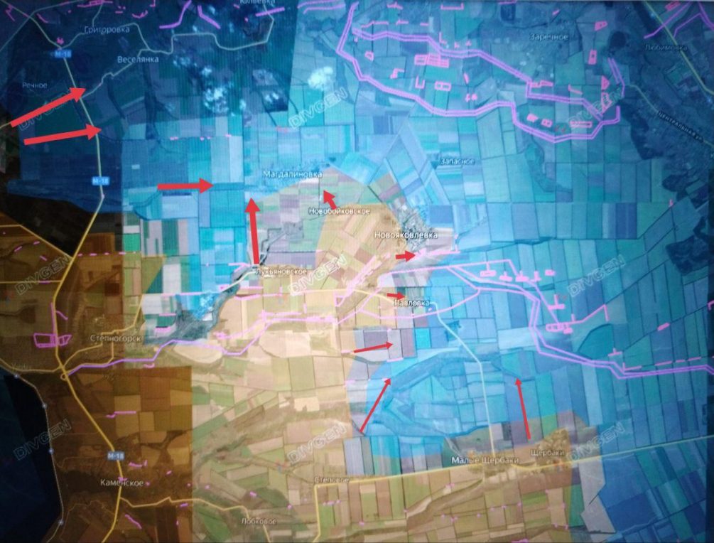 Также продвижение отмечено южнее Павловки и на подступах к Магдаленовке. В Новояковлевке бои идут за опорные пункты на южной окраине. Продвижение создает угрозу выхода к западному логистическому маршруту ВСУ в сторону Орехова.