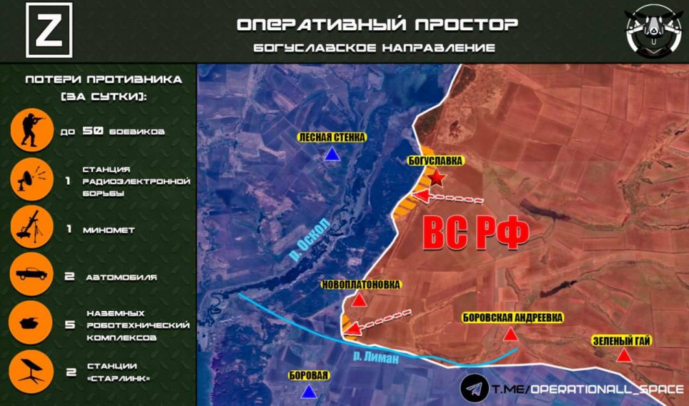 Село Богуславка, расположенное в Боровском районе, находится на восточном берегу реки Оскол. Село стоит на трассе Р79 примерно в полутора километрах к югу от Загрызово, которое было освобождено 27 декабря 2025 года. Продолжение наступления на юг по этому направлению открывает путь к населённым пунктам Новоплатоновка и, в конечном счёте, Боровая. Последний является ключевым логистическим узлом ВСУ на левом берегу Оскола, контролирующим одну из трёх переправ в районе Гороховатки.