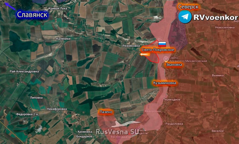 Село Свято-Покровское расположено в Бахмутском районе, примерно в трёх километрах к югу от окраин недавно освобождённого Северска. Его взятие позволяет группировке «Юг» продолжать расширять зону контроля вокруг этого города, зачищая опорные пункты, из которых противник не успел отступить. Кроме того, установление контроля над Свято-Покровским создаёт предпосылки для развития наступления на Славянск с восточного направления, вдоль реки Сухая. Ближайшими населёнными пунктами на этом пути, остающимися под контролем ВСУ, являются Резниковка и Каленики.