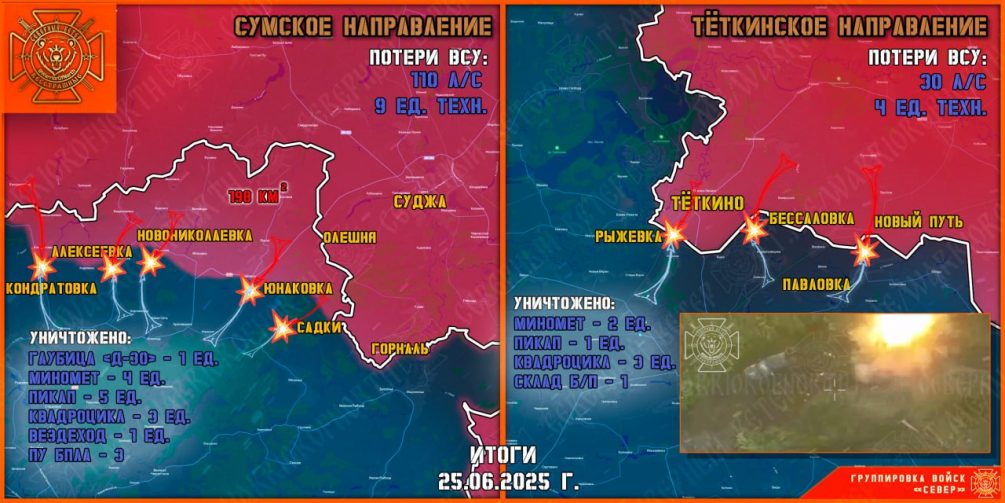 25 июня войска группировки «Север» нанесли мощные удары по передовым и штурмовым подразделениям противника на Тёткинском и Глушковском направлениях СВО, продолжая укреплять полосу безопасности в Сумской области.