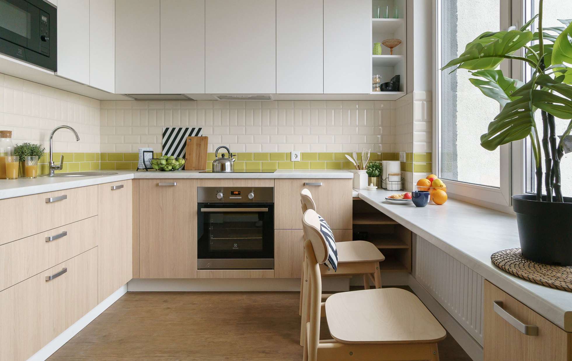 - Технику покупайте постепенно. Сначала самое необходимое — плита, холодильник, вытяжка. Посудомойку и микроволновку можно добавить позже.