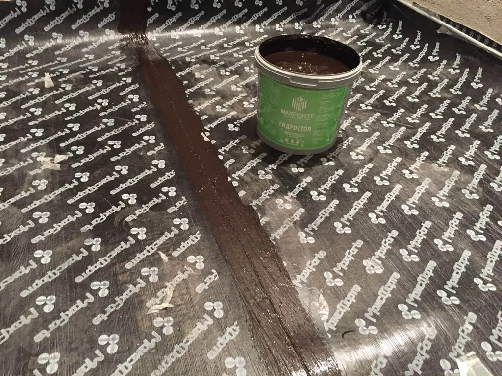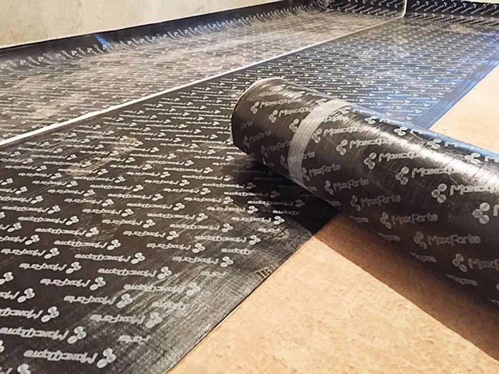 Рулоны нужно укладывать «стык в стык» или «на хлёст», стыки между рулонами МаксФорте — ШумоИзол тщательно замазываются жидкой резиной МаксФорте, либо проклеиваются строительным скотчем. Далее заливается стяжка 50-70мм с поверхностной плотностью ≥ 100 кг/м². Марка бетона М300.