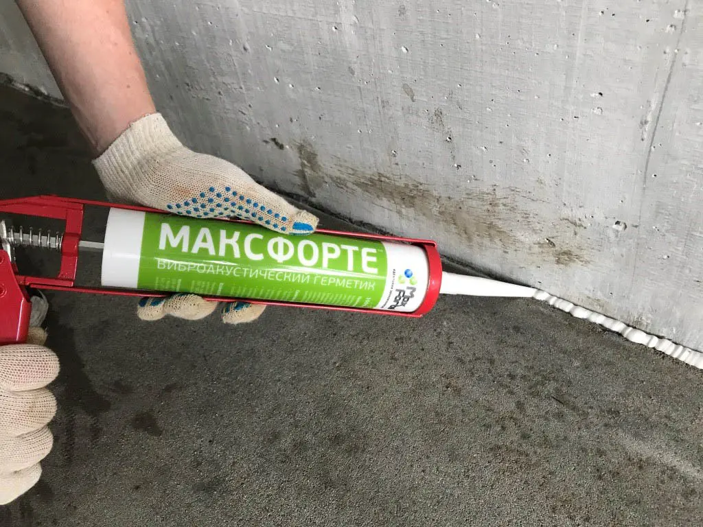 После высыхания стяжки, обрезаются по периметру излишки МаксФорте – ШумоИзол и герметизируются стыки нетвердеющим виброакустическим герметиком МаксФорте.