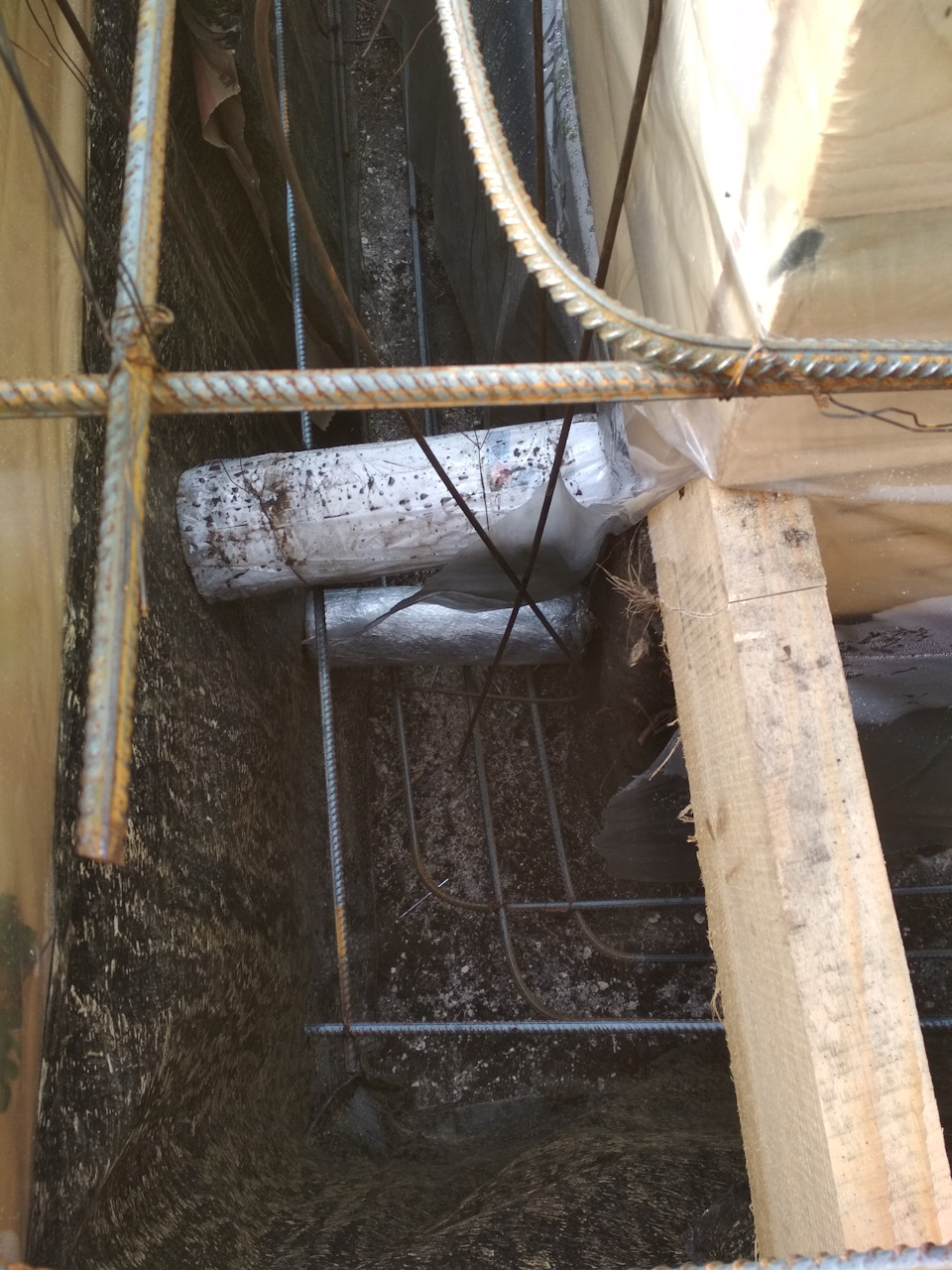 Для будущих коммуникаций и для вентиляции в случае проветриваемого подпола в фундаменте нужно предусмотреть отверстия, для чего вставляются гильзы. Отверстия для вентиляции я хоть и добавил, но позже от подпола я отказался, в результате скорее всего они окажутся невостребованными. Самое нужное отверстие — это для канализации. А вот что я забыл, так это отверстие для подачи воды, а также большой ошибкой было оставить в опалубке временные распорки деревянные — придется их выковыривать.