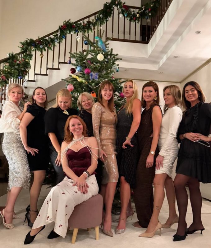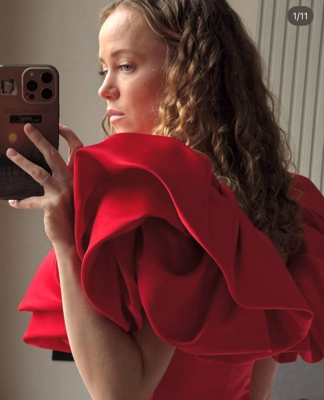 Например, вот вам два абсолютно разных примера нарядов в красной гамме. Катерина Ковальчук взяла платье классического красного цвета, но с акцентными плечами, а Юлия Ковальчук решила нарядиться в винный костюм с пайетками.